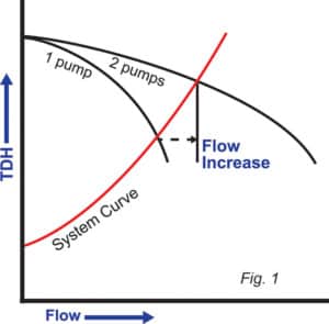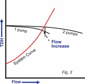 例如,假設(shè)有一組固定噴嘴,其中系統(tǒng)阻力是純摩擦的,并且僅作為流量變化的結(jié)果而變化。當引入第二個泵時,系統(tǒng)中的阻力會隨著流量的增加而增加。
