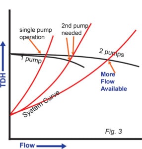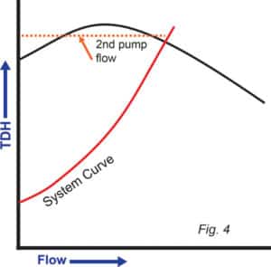 在圖 4 中,系統(tǒng)曲線和 TDH 曲線在大于關(guān)閉 TDH 值的 TDH 和低于曲線的最大 TDH 的 TDH 處相交。當?shù)诙€泵啟動時,流量將僅增加到 TDH 與系統(tǒng)壓力匹配的第一個點。
