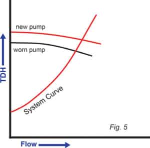 當一個泵磨損時,可能會出現(xiàn)類似的情況。這在圖 5 中有所提及。隨著泵的磨損,在任何給定流速下產(chǎn)生的 TDH 量都會減少。如果新泵與系統(tǒng)曲線的交點并聯(lián)在磨損泵的關(guān)閉TDH之上,它將迫使磨損泵進入關(guān)閉狀態(tài)。