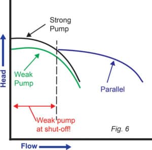 這里的危險在于系統(tǒng)-泵的相互作用。如果系統(tǒng)曲線與特性曲線相交的 TDH 高于弱泵關(guān)斷流量,弱泵將被迫關(guān)斷運行,可能發(fā)生嚴重故障。